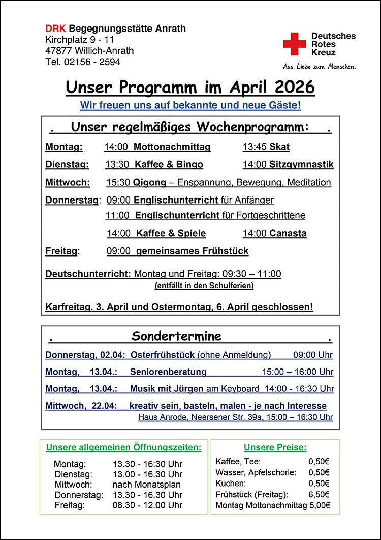 Jeden Monat erwartet Sie bei uns ein abwechslungsreiches Programm. Neben unseren wöchentlichen Angeboten, bestehend aus Spielen, Gymnastik, Frühstück und vielem mehr, wird das Programm immer wieder um besondere Aktionen ergänzt. Es lohnt sich also, regelmäßig bei uns vorbeizuschauen.
